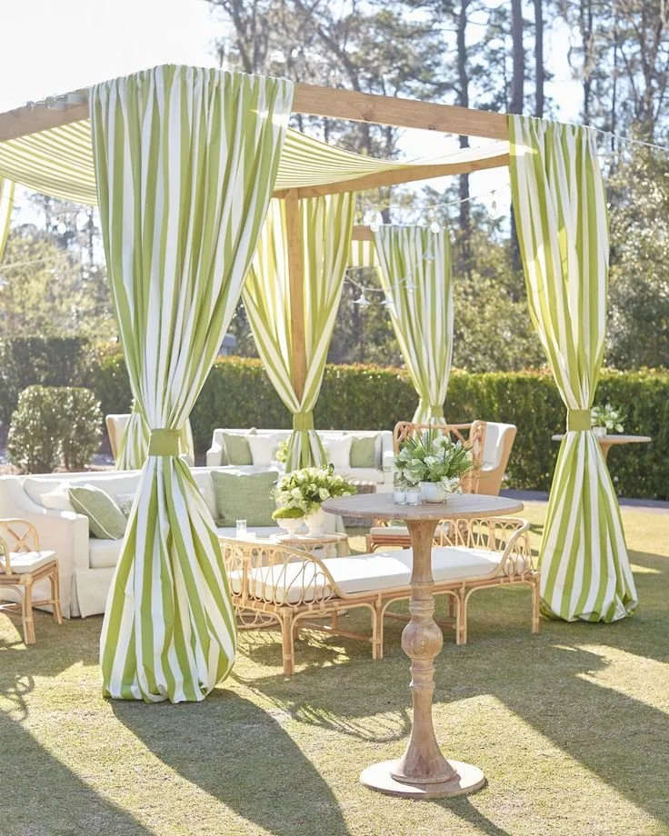 Stripes are making a comeback in summer 2025. Wide, bold lines on tablecloths or lounge backdrops inject a playful rhythm, while monochromatic schemes keep it refined.